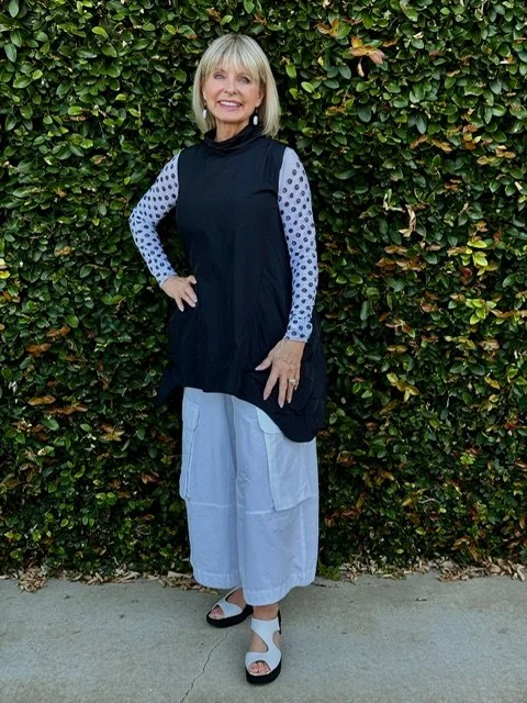 Polka dot body stocking, Kozan vest & Urban by Alembika white pants (also in black)
